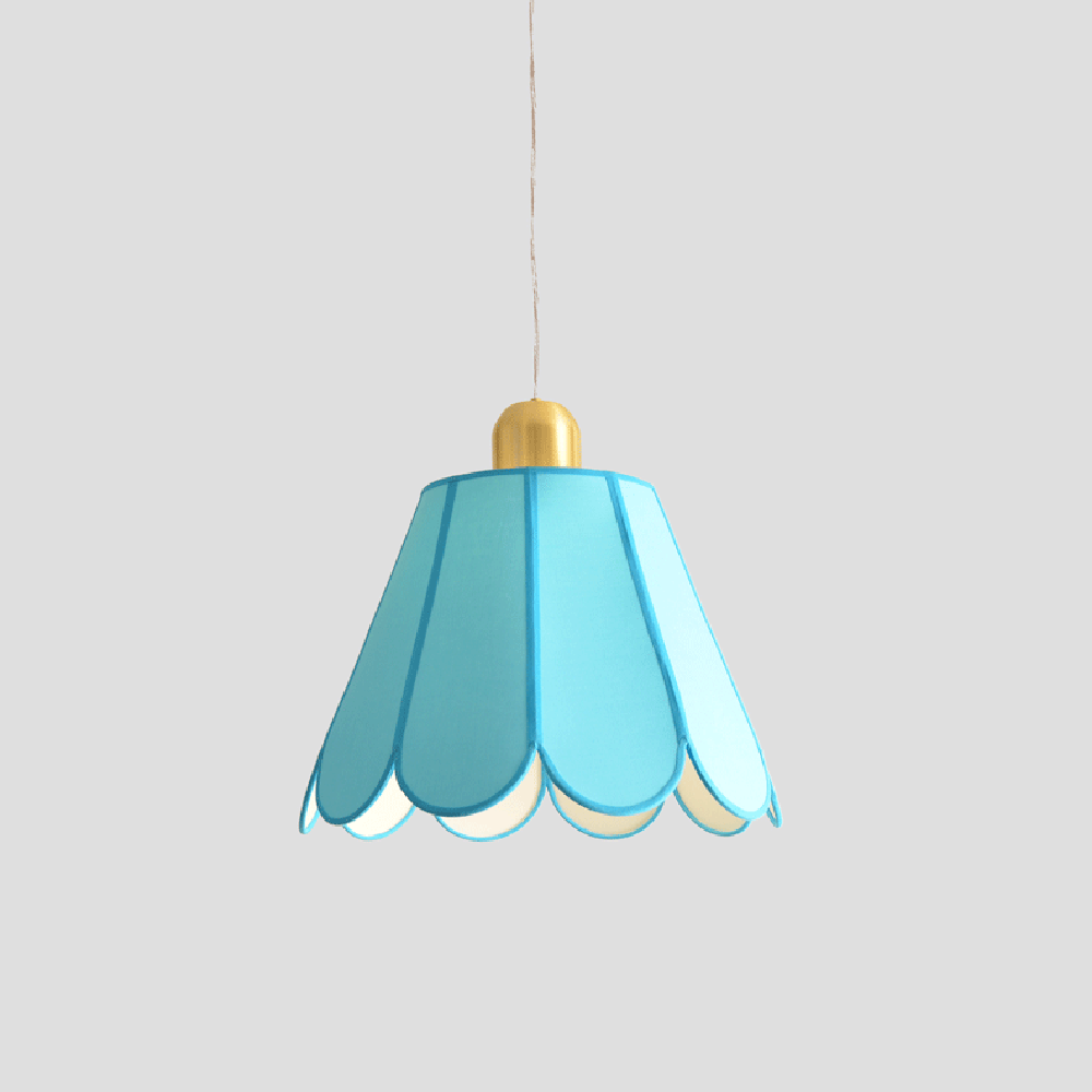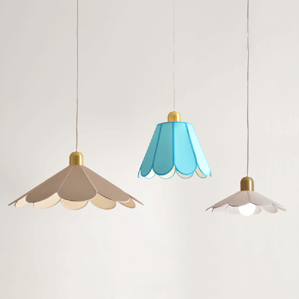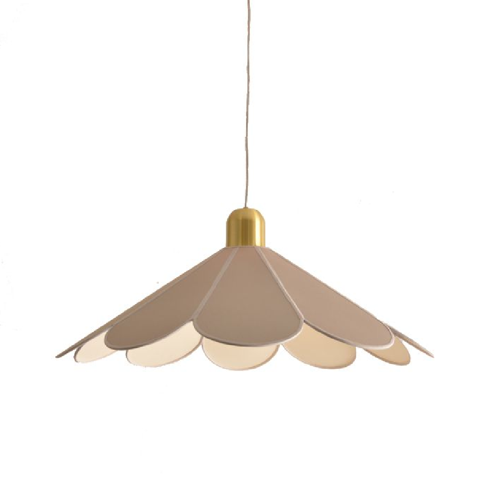Pendentes delicados, cujas extremidades arredondadas lembram pétalas de flores. Cada peça é desenvolvida utilizando a técnica de gomos, que permite criar formas cônicas arredondadas e explorar uma ampla variedade de formatos. As cúpulas de tecido, além de emitirem uma luz agradável e suave, oferecem versatilidade em cores e tamanhos, permitindo que os pendentes sejam personalizados para diferentes ambientes.