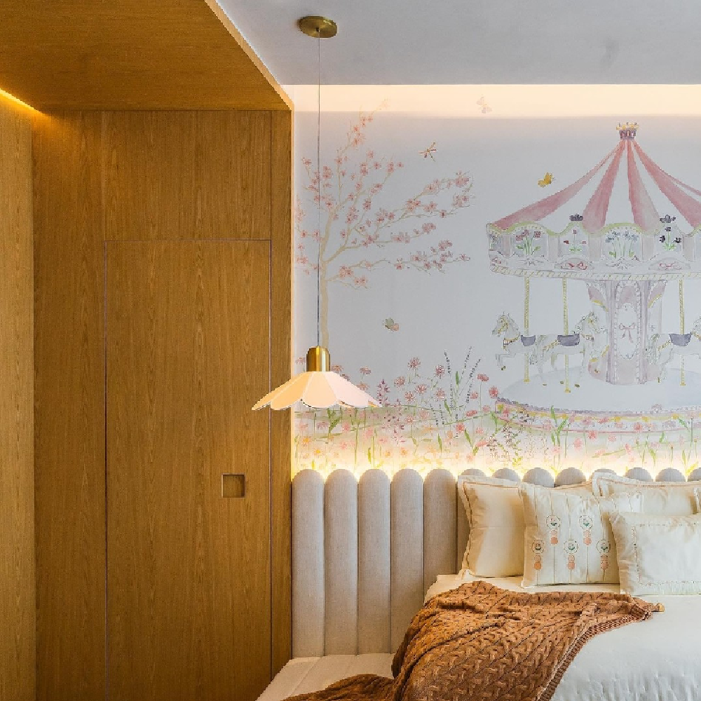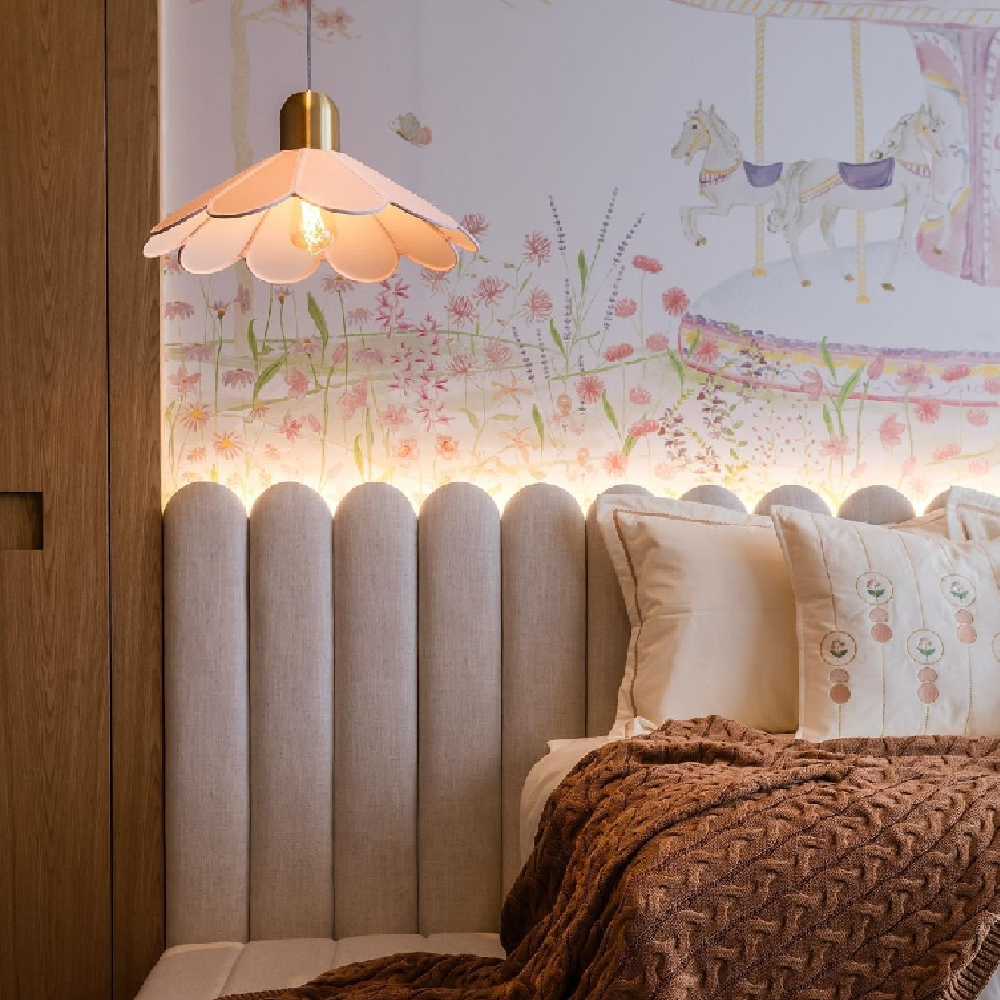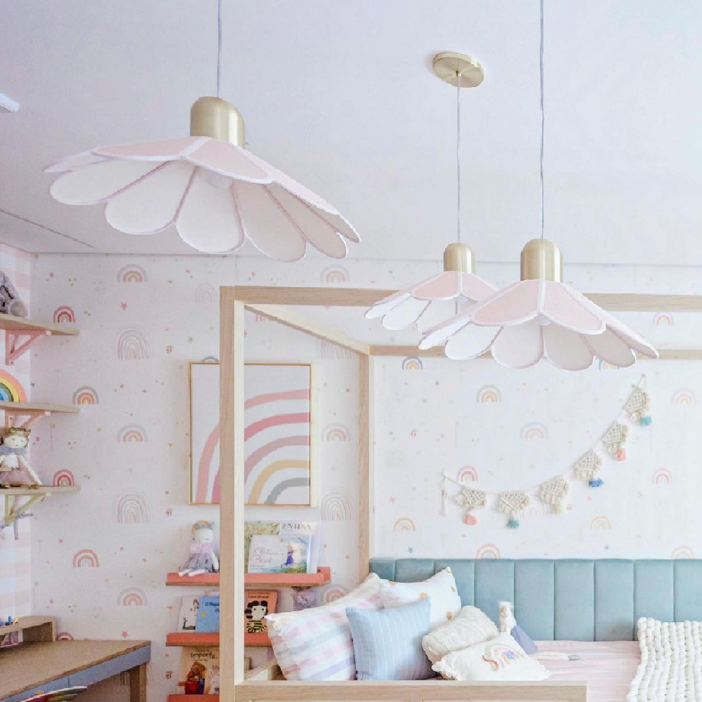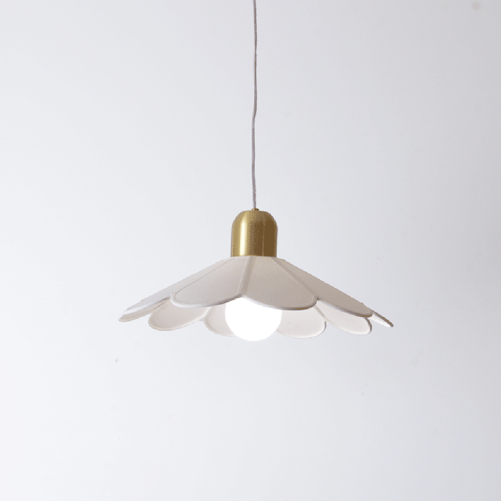 Pendentes delicados, cujas extremidades arredondadas lembram pétalas de flores. Cada peça é desenvolvida utilizando a técnica de gomos, que permite criar formas cônicas arredondadas e explorar uma ampla variedade de formatos. As cúpulas de tecido, além de emitirem uma luz agradável e suave, oferecem versatilidade em cores e tamanhos, permitindo que os pendentes sejam personalizados para diferentes ambientes.