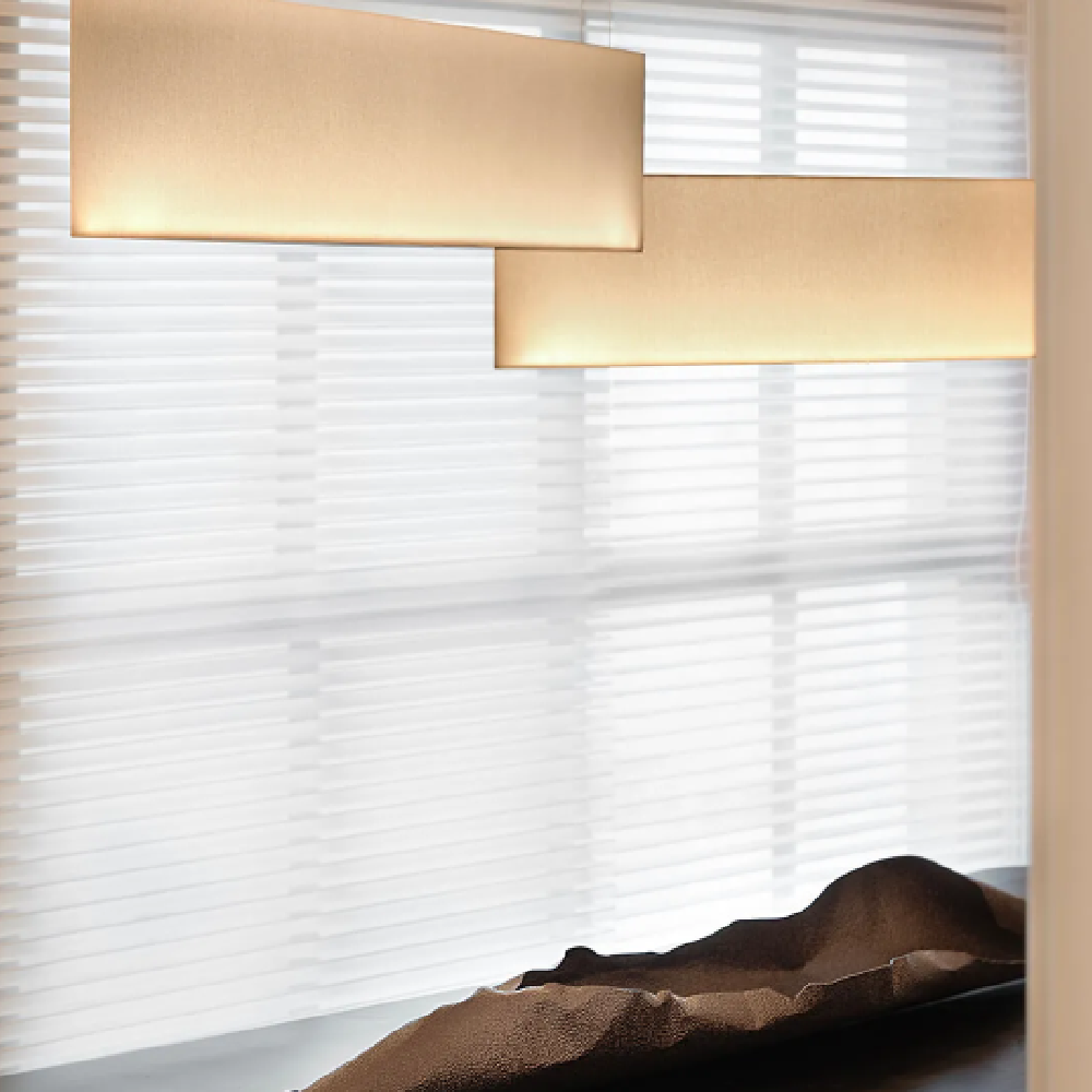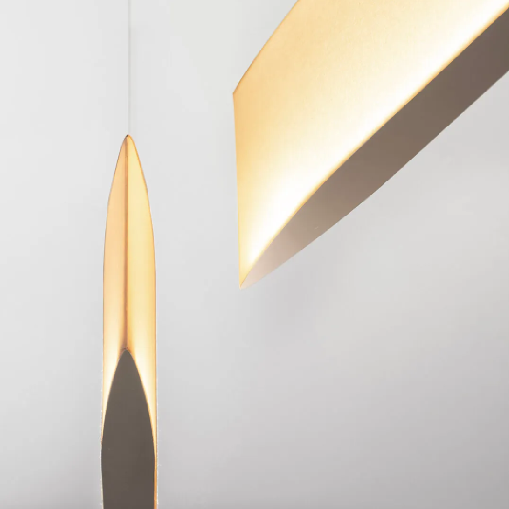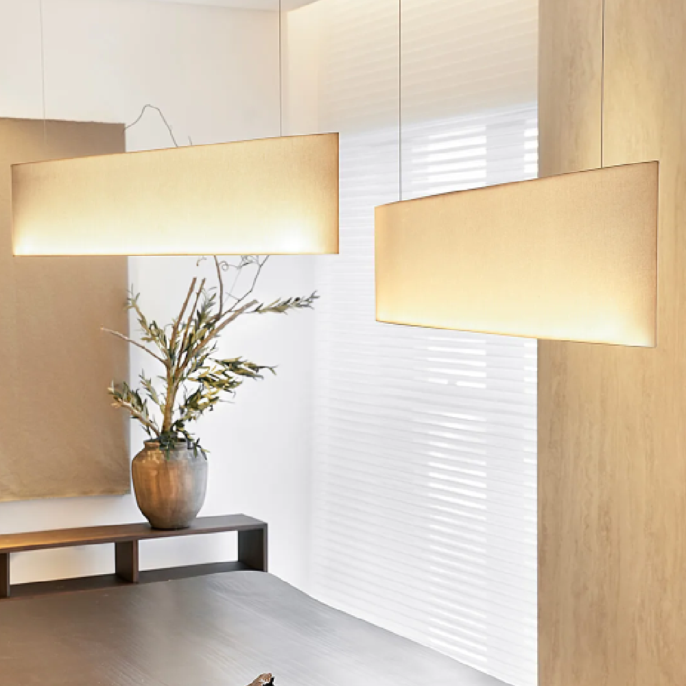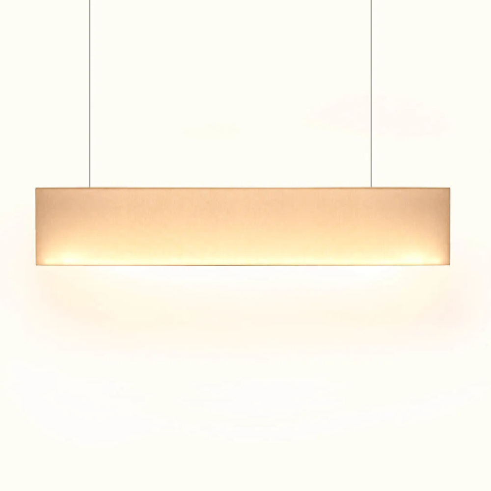 sutileza.Pendente de forma longitudinal, com iluminação difusa ascendente que